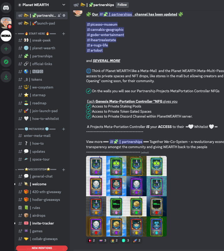 With over 27+ partnership projects in our We-CoSystem, there is ALWAYS something in the pipe line. Stay up to date with the latest Drops by Joining our Planet WEARTH Discord and your chance to earn FREE airdrops.
