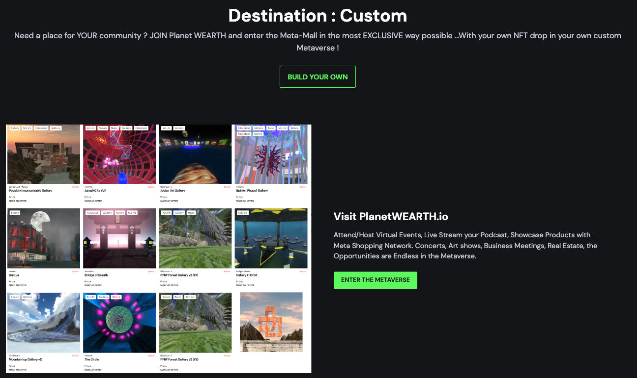 Focus on your community we handle the rest!ACCESS Planet WEARTH collection of Customizable spaces or work with our Team of MetaBuilders to help design your very own CUSTOM spaceNFTs have various rarities